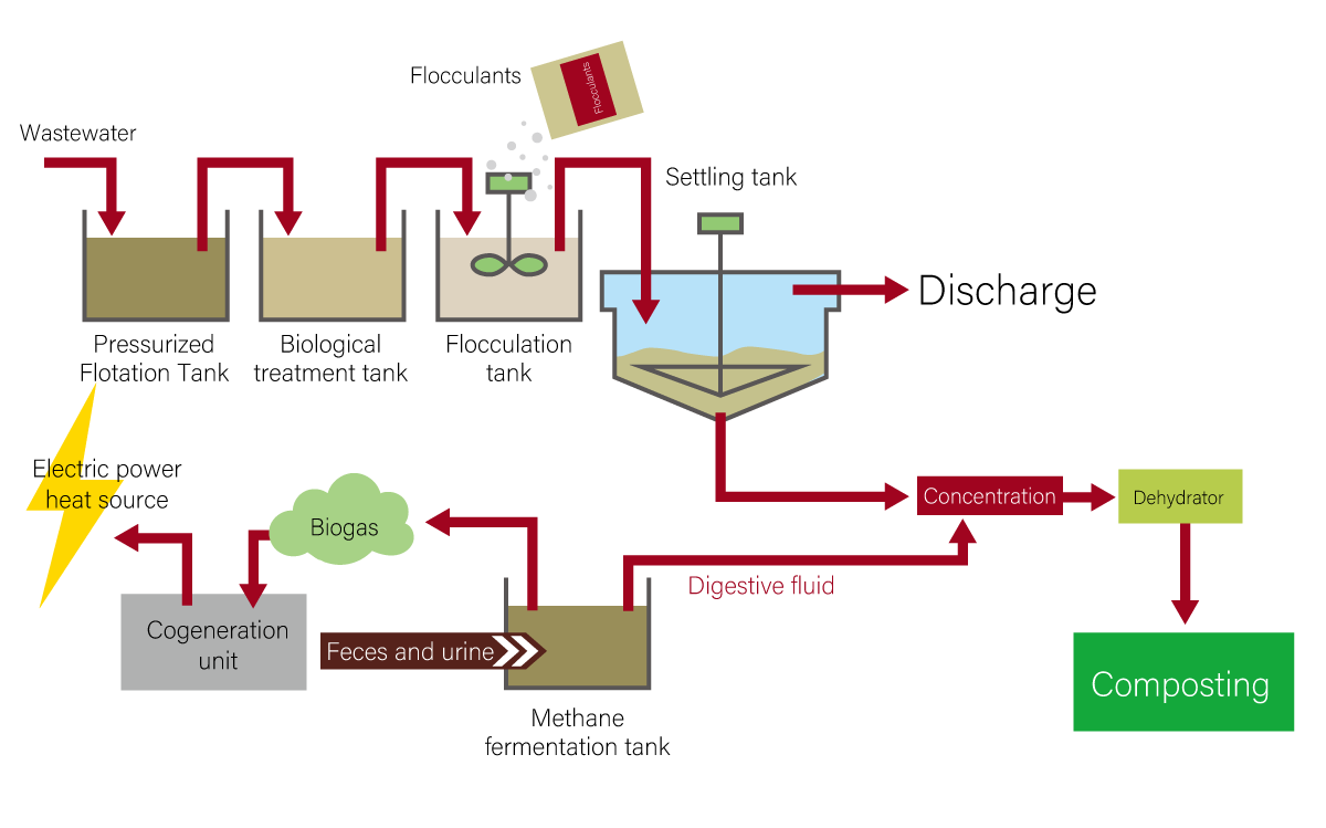 Wastewater from urine and on-site water is aerated, precipitated, and strained in a dehydrator for solid-liquid separation, and the dewatered solids are composted in the compost house.