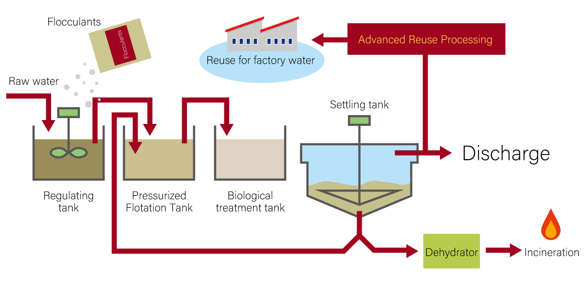 Công nghệ xử lý nước thải và các nỗ lực giảm thiểu chất thải cũng rất tiên tiến; ví dụ, một số nhà máy được trang bị lò hơi đốt bùn và các hệ thống xả thải bằng không (zero discharge).
